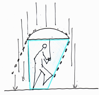 But this projection must be small to keep off the drops still falling vertically above the walker.