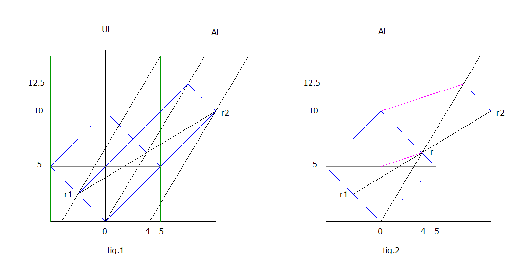 For A in fig.2, r1 and r2 form a relative axis of simultaneity, with both events assigned to event r on A's timeline. The magenta line transforms U time to A time (12.5*.8 = 10), i.e. equal round trip times for A and U. The magenta line from r to (5, 0) confirms this.