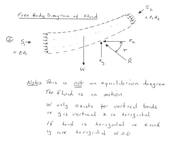 If we consider the fluid inside the bend between sections S1-S1 and S2-S2 and draw a free body diagram we obtain fig2.