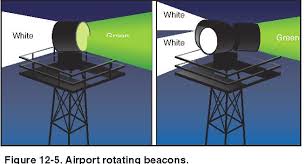 An airway beacon has two distinct light characteristics: A revolving narrow white light beam about 5 degrees wide in azimuth and a set of fixed colored course lights of about 15 degrees width.