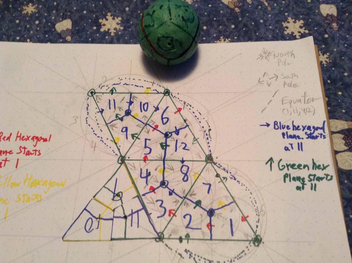 Studying the new layout of the spheres gave me two insights. One, what looks wrong at first, is not, and two, my confusion with the green and blue hexagonal planes comes from the fact that the green is not continuous in the presentation, and is divided up into three thirds of a great circle. This combined with the fact that I switched 11 and 12 conceptually, in terms of how the direction of increasing degrees on the plane leaves the diamond. In the case of 11 blue goes up and to the right (conceptually going with the first layout I presented with the four equatorial diamonds, the four diamonds touching the North Pole, and the four touching the South,) whereas in the case of 12 the blue goes down and to the right and the green goes down and to the left.) This is because 11 and 12 are directly opposed and the blue and green planes cross at both 11 and 12. Interesting to note that 11 and 12 are therefore the only two diamonds that are not included on either the red or yellow hexagonal plane. In my original convention I tried to take this potential confusion into consideration by having each color plane have three diamonds with a capital letter, indicating "heading North" and three with a little letter indicating "heading South" and then added another convention where the order of the two colors addressed in a diamond would be the one whose arrow was running SW to NE or NE to SW and the second letter would be that of the color running SE to NW or NW to SE.