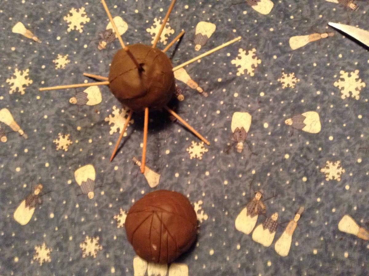 Sorry, those are lousy and confusing pictures. Each of the two balls is showing something different. The one with the toothpicks is the eight diamonds with a pick at the North pole, the south, four equal distance from each other in the Northern Hemisphere, and four in the South. They form the vertices of the diamonds. Two four points at the poles and eight three points, four each equal distance from the respective poles and spun around the axis of the poles 45 degrees from each other.