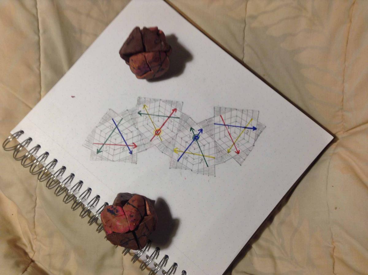 I then proceeded to make six such crosses, which is exactly how many of such crosses there are on the sphere. On the sphere the ends of the crosses touch exactly, as exhibit by the Spherical Rhomic Dodecahedron. They do not touch exactly on a 2d surface, because the 90 degree angles and the 120 degree angles work out differently on a sphere than they do on paper.