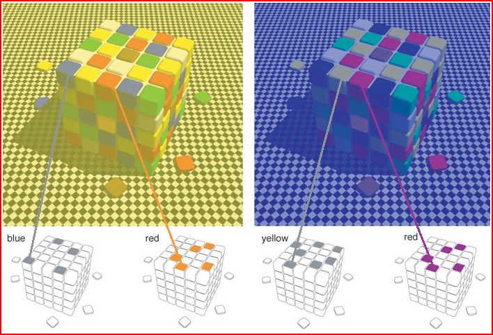 I used the color dropper in Paint to pick up the colour of the blue and red squares on the upper surface of the yellow-filtered image, and the yellow and red squares from the blue-filtered image, then used that colour to draw lines from the squares to the corresponding cells in the line drawings below. Lines, squares and cells in the line drawings are all the same colour. Each line to my eye appears to change colour as you move along it! But the colors are the same throughout.