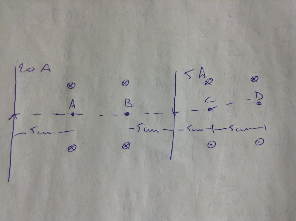 I'd say it has something to do with the distance from C and D to both the conductor with 20 A and the one with 5 A, but it doesn't make sense to me why the 'things', whether they are conductors or magnetic field lines, above and under C (and D) are opposite to each other?