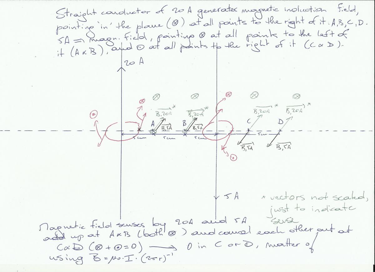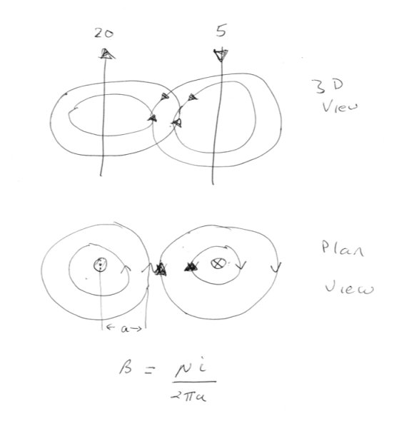 Now the fields are additive and the field around a single wire is circular and inversely proportional to the diatance from it and given by the equation at the bottom of my sketch.