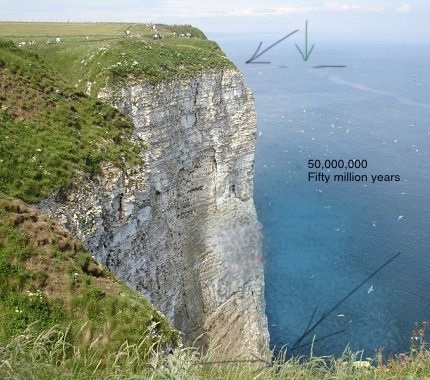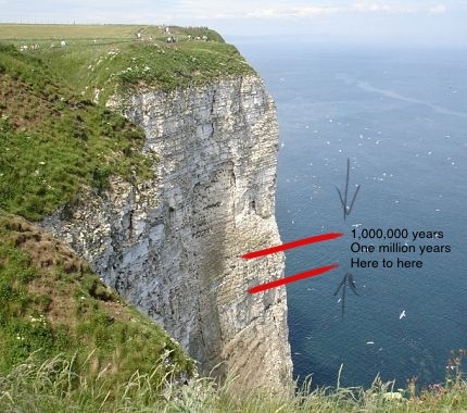 So when you look at the cliff close up , say the cliff is 50 meters high . Then the whole cliff might have taken 50 million years to deposit the particles, sand ,shells or whatever. So