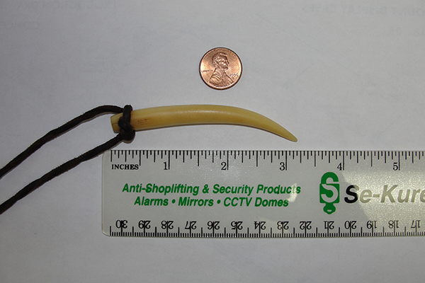 I am in possession of a canine tooth which was gifted to me while living in Honduras 16 years ago. I have always wondered what type of animal it came from. See attached images. It is 3-1/4" (82mm) long x 1/4" (7mm) diameter. I would be guessing that it came from either a cat-like carnivore or possibly monkey or even a tapir. Let me know what your thoughts are.