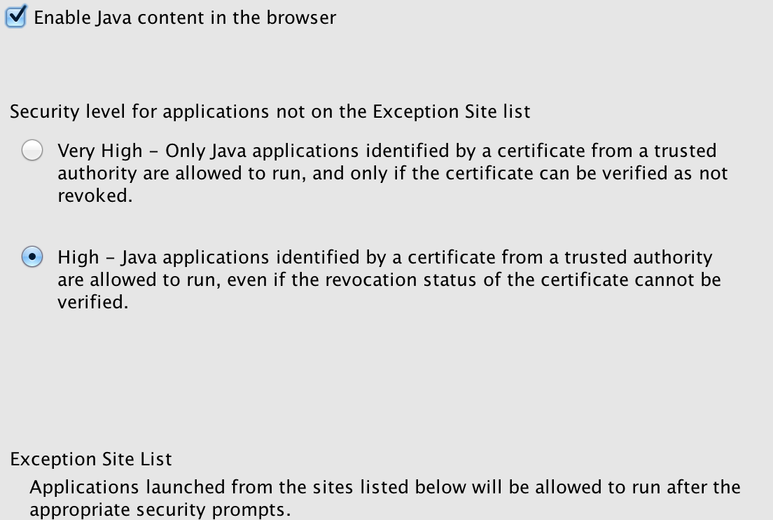I cannot access some websites because of the Java security, but when go to the security settings of Java, it only shows the 'Very High' and 'High' security settings. It does not show the 'Middle' security. I used to have it, but for some reason it is not there anymore.