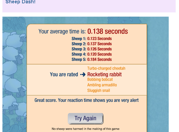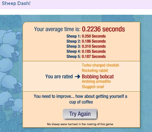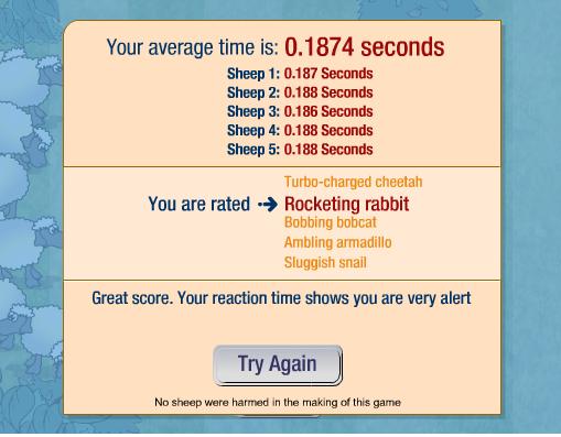 I tried playing with my left hand (I'm right handed) and that didn't seem to make too much of a difference. I did notice that it's the sheep running across the bottom of the screen that are the most difficult to get. The ones on top are the easiest. I don't know why. But after about 5 total games I found that the ones on top I can get in about .05-.1 seconds, the middle ones about .12-.14 seconds and on bottom about .2 seconds. Weird.