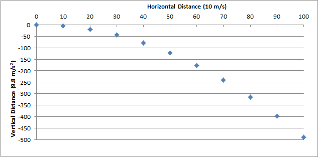 Here is a plot of how a thrown object falls. The dots are 1 second apart. In this example, it is thrown with a horizontal velocity of 10m/s. See how it moves 10 m horizontally in each second. But see how the distance it falls vertically increases each second because it is accelerating.
