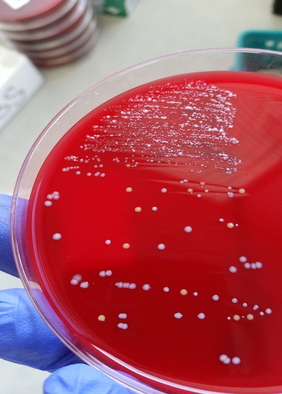 Today I have noticed several M. luteus colonies on TSBA 5%. You can easily spot the bright yellow bacteria among coagulase negative Staphilococci, which are white (see attachment).