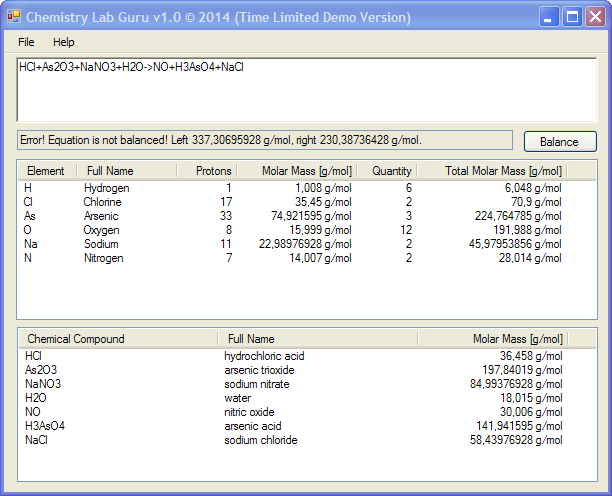 [latex] HCl + As2O3 + NaNO3 + 3H2O -> NO + 2H3AsO4 + NaCl [/latex]