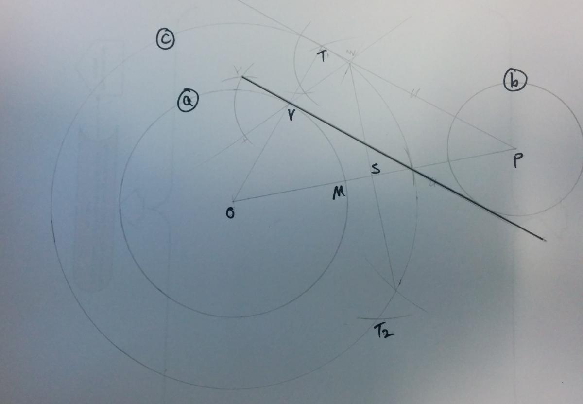 6. Mark circle C with intersection of Arcs with centre S and radius OS. Call these points T and T2