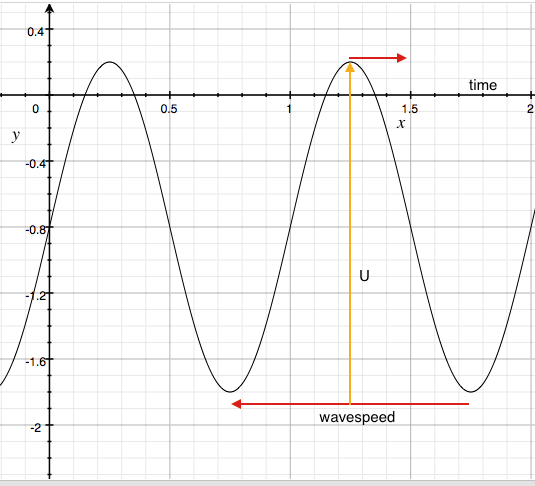 In this above image, we can see a simple sine wave with peaks and troughs symmetric around the time axis, the wave potential U is the full potential of the wave from peak to trough. So what will be the wave speed of the peaks and the troughs?