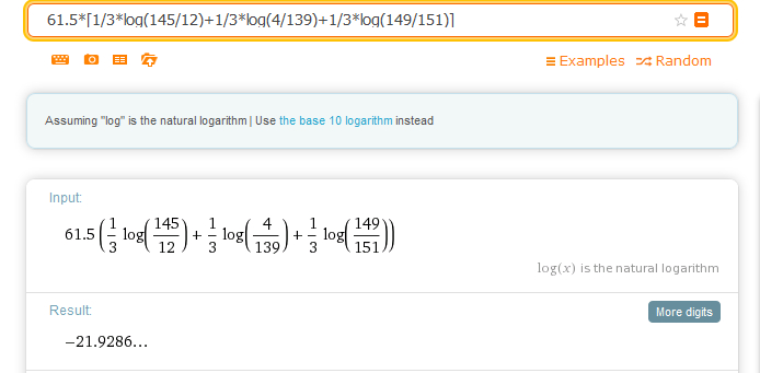 http://www.wolframalpha.com/input/?i=61.5*%5B1%2F3*log%28145%2F12%29%2B1%2F3*log%284%2F139%29%2B1%2F3*log%28149%2F151%29%5D