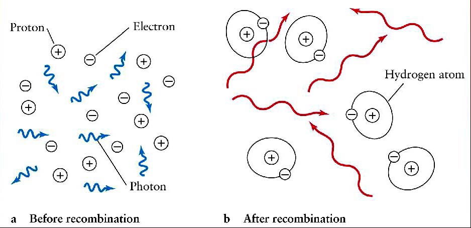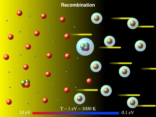 I would surmise we are back at the recombination event . At approximately 300,000 years after the Big Bang . When free electrons , and hydrogen nuclei ,( with a small percentage of helium nuclei ) , namely protons were just sufficiently cooling . Thus to experience an orthogonal attractive force (electrons ) toward the protons.