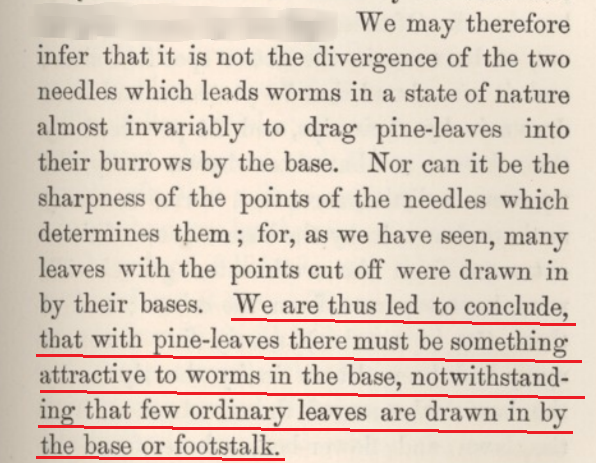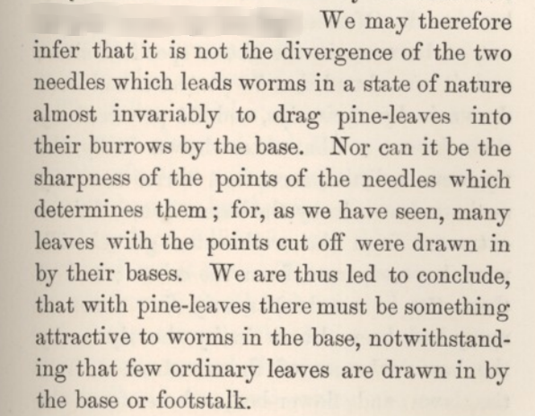 ...In a gravel walk in my garden I found many hundred leaves of a pine-tree (P. austriaca or nigricans) drawn by their bases into burrows. The surfaces by which these leaves are articulated to the branches are shaped in as peculiar a manner as is the joint between the leg-bones of a quadruped; and if these surfaces had been in the least bit gnawed, the fact would have been immediately visible, but there was no trace of gnawing. Of ordinary dicotyledonous leaves, all those which are dragged into burrows are not gnawed. ...
