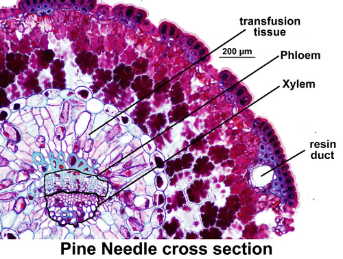 "Phloem transports the sugars that are produced in photosynthesis from the leaves to the rest of the plant. The phloem cells are small and thin-walled; in this slide, as in many others, the phloem cells appear blue."