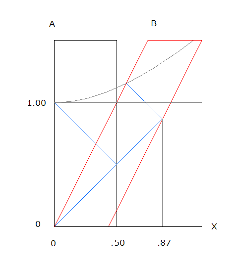 The hyperbola is a constant time t=1, wherever it intersects the path of a moving object. In the A frame (black) light requires 1 unit of time to reflect from the end of a stick .5 units long. If the same measurement is expected in the B frame (red), the same stick requires a physical length contraction.
