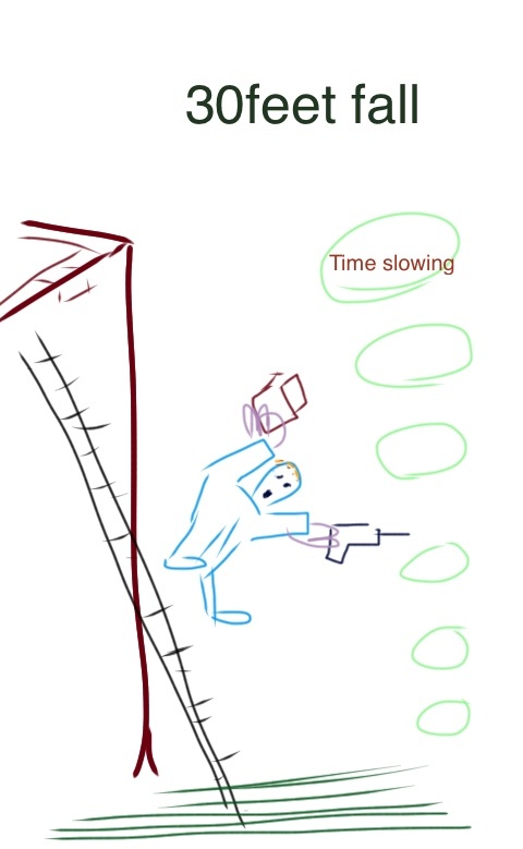 I was in my 30's ( years old ) doing a construction job for a fellow businessman. His company was installing the roof on a new sports facility squash court. He asked me to drill holes on the top of the squash court walls , so that his metal roof installation could be bolted on . I was at the top of a very long extending ladder 30 feet or more. Masonry drill in one hand , gripping the top of wall red bricks with the other hand .i had successfully done many fastening position holes. On this particular occasion /moment , I was drilling.... Then found myself descending backwards ground wards with a drill in one hand , a brick in the other. I realised or experienced the compressed idea that I was about to die. No way could I survive this fall,