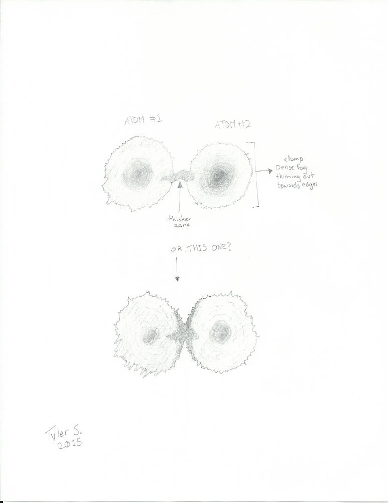 studiot: I drew a picture. See below. Do the picture match your conceptual description of atoms? I drew two different groups of atoms as clumps of dense fog (1st located top and 2nd located below on the picture); I was unsure about the first one...it could be inaccurate representation of your conceptual description, so I drew second group.