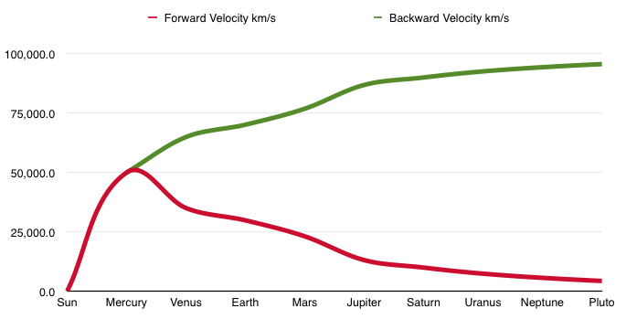 [edits: I realised after posting this that the original plot was wrong. The formula for the backwards velocity should be the backwards velocity of the first planet plus the difference in velocity between the first planet and the next planet, summing the differences gives an ever increasing retro velocity - Sorry about the confusion]