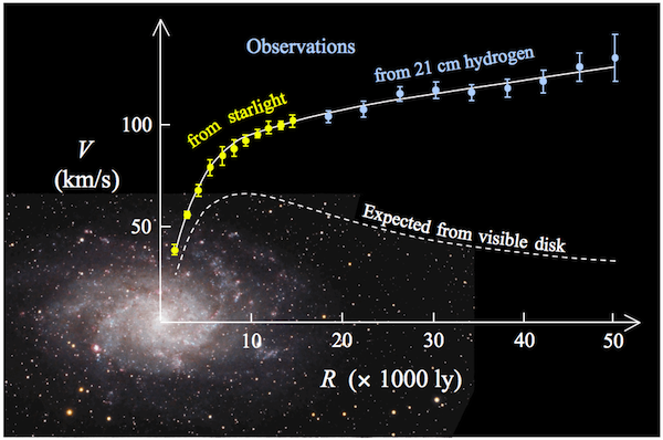 Unable to explain such flat rotation curves, theoreticians proposed that there had to be additional matter to what was visible in the galaxy in order to account for the flat rotation curve, and it was coined "dark matter".