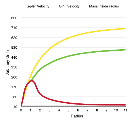 Now we can go and find some real data from galaxy rotation curves and try my method. I have a friend who is an astronomer, he may be able to get me some real data to play with. Essentially all I need is the visible mass distribution of a galaxy and the observed rotation curves, and I should be able to show that my rotation curve corresponds with the observed rotation curve without introducing any dark matter.