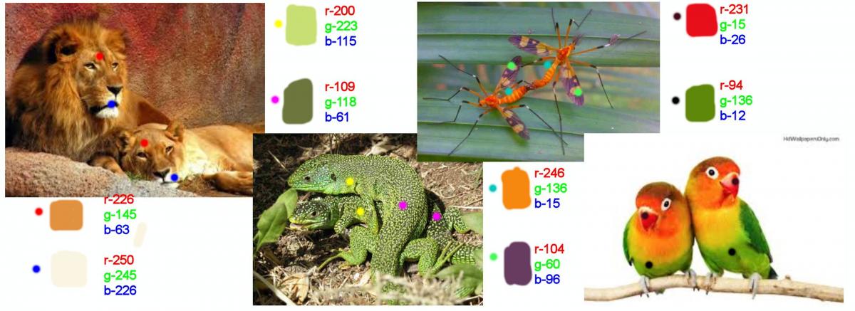 For example there is a red dot on both of the lions, the area that this dot represents is the same color on each animal and below the picture you will notice a sample of this color along with its numeric value. There is also a blue dot on each lion which also represent the exact same color on both animals and again the colors sample and numeric values are below the pic. Each pictures was done the same way, just match the colors of the dots.