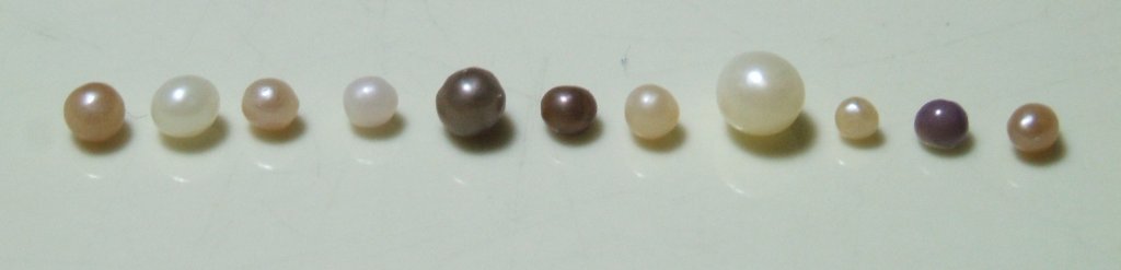 I will add to this question, by submitting these images. Every pearl in all the images are from the same location and the same species, California mussels (Mytilus californianus).