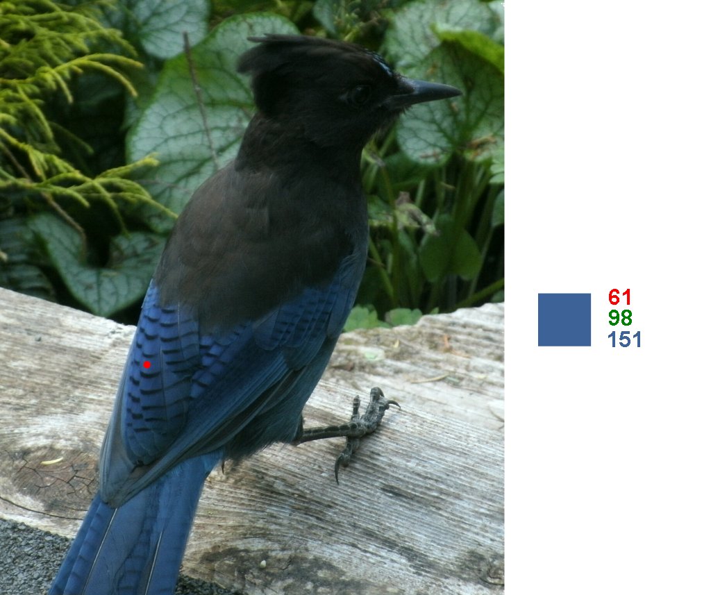 I did not have Stellar's Jay in my North American bird book, but searching on the internet, the pictures were varied enough so that the particular numbers you show, would not be the ones each picture would yield, so, somehow a correction factor, or a "bringing a picture to a standard state" has to be developed. Even if it is something like "take a picture of the male of the species in full sun with the sun behind you between 45 and 55 degrees elevated and have the bird facing away from you with the length of the body pointing between perpendicular to your line of site and parallel to you line of site, between this and that angle, and have the bird between this and that height higher than your position, and take the picture with this camera and this lens and these filters, and store the image in this manner and display it on this device in this manner, and select a pixel at this particular location on the bird and read its RGB value."