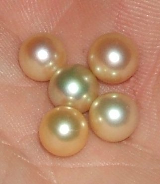 Why are the grafted round pearls gold, not peacock as the image suggests. Why does one have green overtones and why does the other have red? At this time, I'll submit to you, that pigmented color is dictated by mucopolysaccharides and glycoproteins in the donor, not the recipent nor the environment. Overtones are dictated by the orientation of the aragonitie tablets within the extracrystalline structure.
