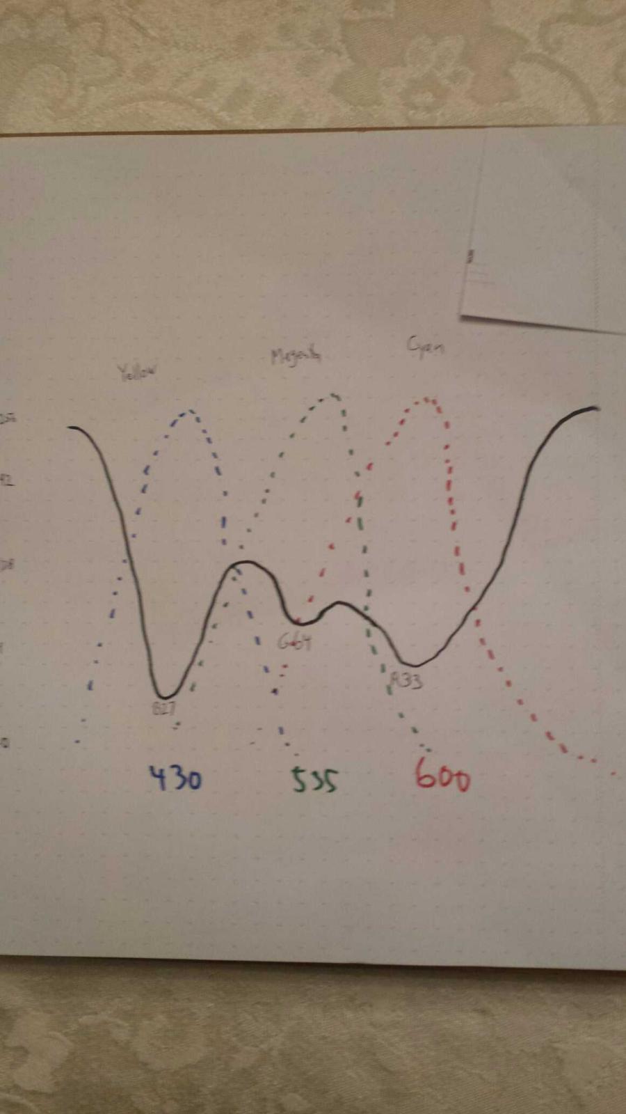 If you take the chart with the three bell type curves and conceptually imagine the animal absorbing part of white light (a straight horizontal line across the top) you could "plot" your numbers, and imagine a particular absorption curve, as to what light sensitive pigments are present in the animal.