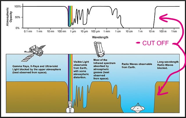 Interesting this last quote shows there is a window by which some radio waves will pass through the various barriers toward the earth . And outside this window it is not possible .( with the exception of the other window around visible light and infrared) . It would appear some short and long wave radio waves are possible BUT there is a cut off point as the waves get longer and longer and the signals get attenuated at this point and below in frequency ( longer wave length ) . Need to find out what those cut off statistics are ?