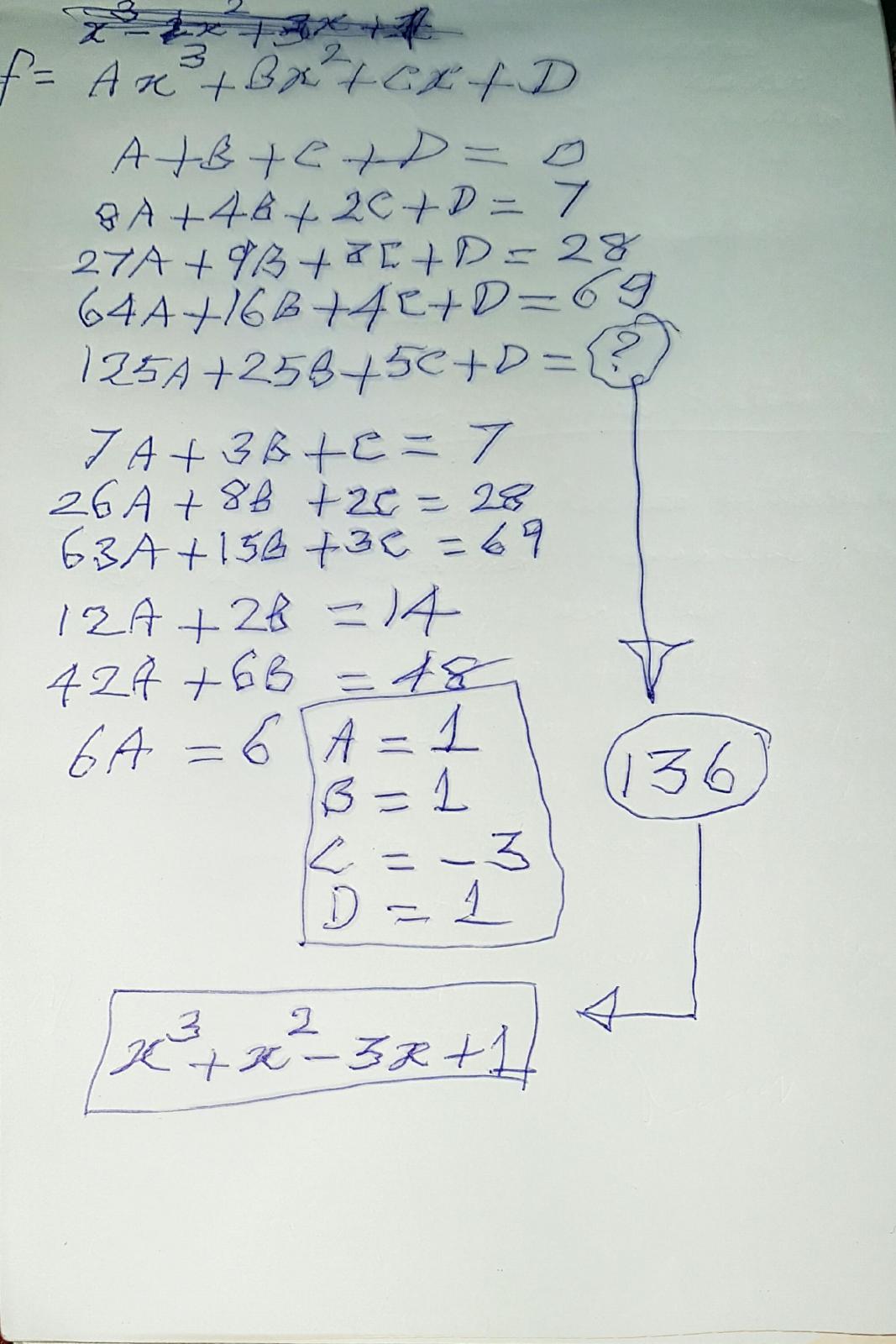 f (1) = 0 ; f (2) = 7 ; f (3) = 28 ; f (4) = 69 and ? = f (5)