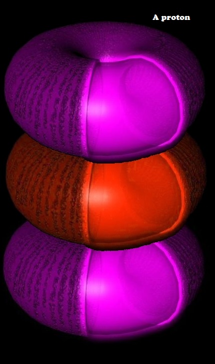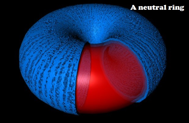 Form three: the composite torus leads to the neutral ring, which also has a fixed amount of mass, charge and spin, although the charge is hidden as the positive and negative amounts are equal. In the model, the proton is a positron sandwiched between two neutral rings.