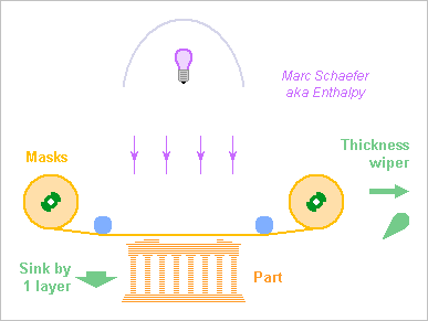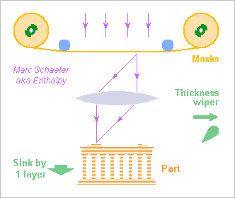 To go faster but keep the rapid prototype ability, the second proposal sweeps an array of switchable sources or faders over the new part layer. It sounds logical - though not mandatory - to sweep the array together with the wiper and have the array cover the machine's width. Then, the movement resembles much a flat bed scanner.