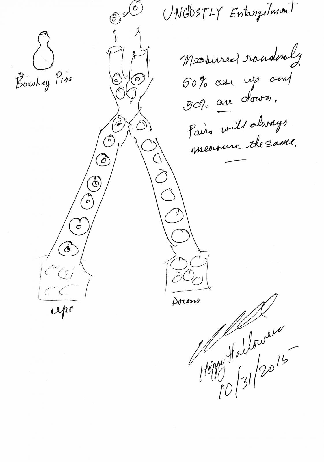 Two lines of bowling pins feed into a device that shoots them off two pins at a time. One line of pins is upright and the other line has the pins inverted. Each line feeds two pins at a time into the shooting device. The two lines of pins feed alternately or randomly into the shooting device. Measuring the results at random times will have 50% up pins and 50% down pins. However, if one pair of pins is fired then measured both pins will be either up or down, regardless of the time or place of the measurement.