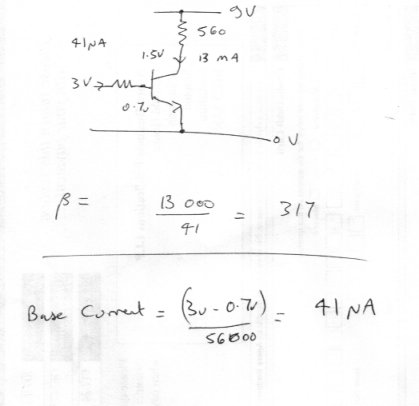 So the current in the base resistor is (3-0.7)/56000 or 41 micro amps