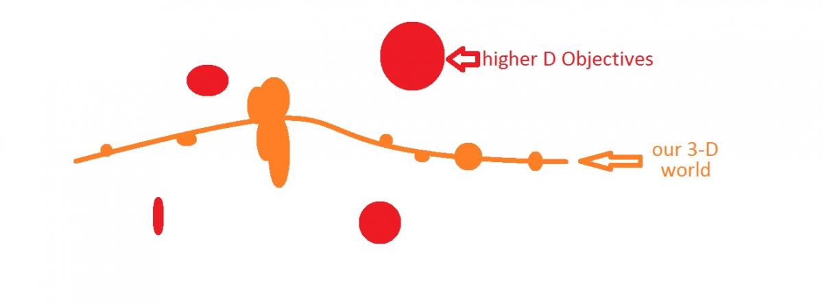 2. Our 3-d world is mostly flat in higher dimensions. However, there are objects that could extend deep in higher dimensions, which should be able to identified since they have unusually higher mass than what we predict by our 3-D measurement (volume/density). They are the source for "dark energy" and "dark matter".post-115997-0-05804000-1455321972_thumb.jpg