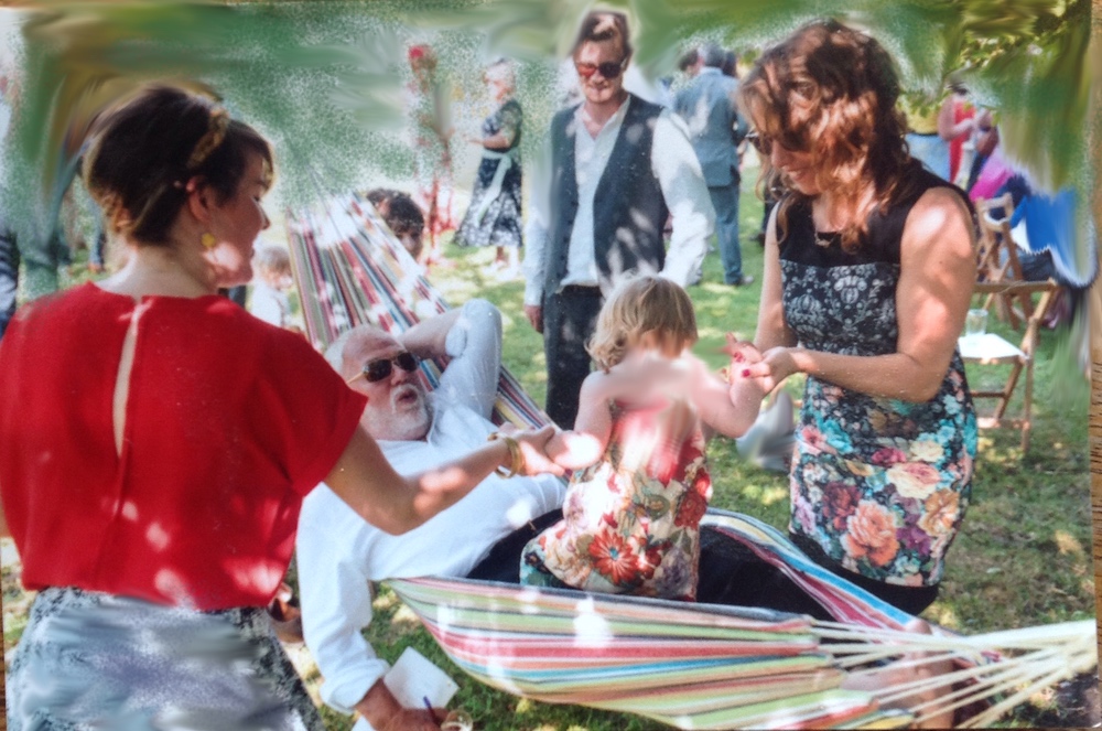 The women are clearly seen looking delightful and overtly colourful , demonstrating the delight of a young child, and no doubt talking , as are the ladies in the background , discussing " did you know so and so has had another baby " and I am clearly seen clutching a pencil and paper so as to make notes of some latest scientific thought or theory ! Real live scientific observational evidence . ,