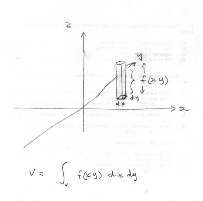 If we now sum these over the whole area on the xy plane we obtain the volume you seek.