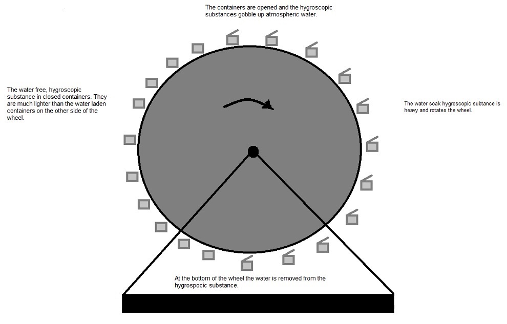 In both cases, there is a limit to how much water will be absorbed. It will require energy to recover the hygroscopic material (either driving the water away from the material or recovering the salt from solution). That is the energy that turns the wheel.