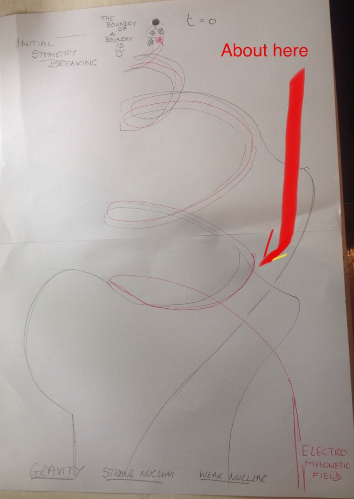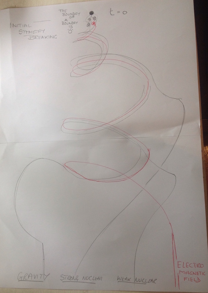 We can extrapolate this all the way back to t=0, where the potential/time graph of the universe is at the top of a Gaussian curve, but with 'ledges' along the way down. One field value for each co-ordinate, but extremely unstable. The universe rolls off the peak of the curve and expands until it comes to rest on the first ledge. This is the first symmetry break, and the original single field decouples into two ( or more ). The number of symmetry breaks that follow, and associated 'ledges' varies according to group theory model being used, but it always results in lower potential, expansion ( more gradual each time ) and more de-coupled fields.