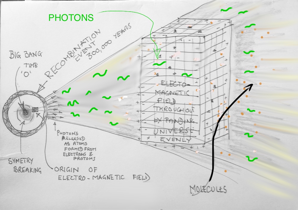 Namely the electro magnetic field needed to be present , held within some form of spacial medium , so as once the universe had cooled sufficiently for free energetic electrons to recombine with nuclear protons and thus make atoms . The medium would be transparent enough , and very importantly