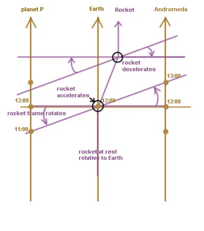 When the rocket accelerates, the rocket frame of simultaneity events rotates counter clockwise. This means Andromeda clock time event beyond 12:00 shows up in rocket frame of simultaneous events. And Planet P clock time event BEFORE 12:00 become part rocket frame of simultaneous events. Per rocket frame clock P runs backward from 12:00 to 11:00 during acceleration.