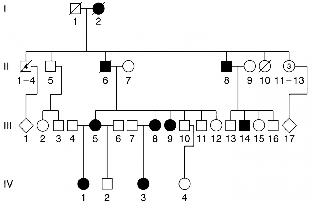 What is the way of the inheritance in the following image and what is the probability/chance that couple III-2 and III-14 will bring mutant descendant/baby if (in case that) they are going to be married?