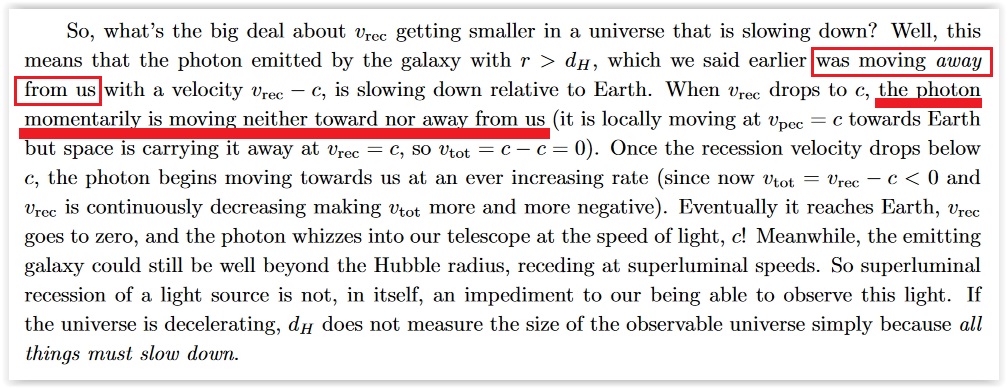 Consider a galaxy located beyond the Hubble radius at a distance r > dH that emits a photon towards Earth. Of course, locally this photon is traveling at v pec=c in accordance with special relativity. But, on account of the expansion, the photon is initially moving away from Earth with a speed vtot=vrec -c>04 (where positive velocities point away from Earth, in the direction of expansion.) Because this galaxy and the light it emits are being swept away from us by the expansion of space, it would indeed seem like this galaxy is forever unobservable. But that would be wrong.