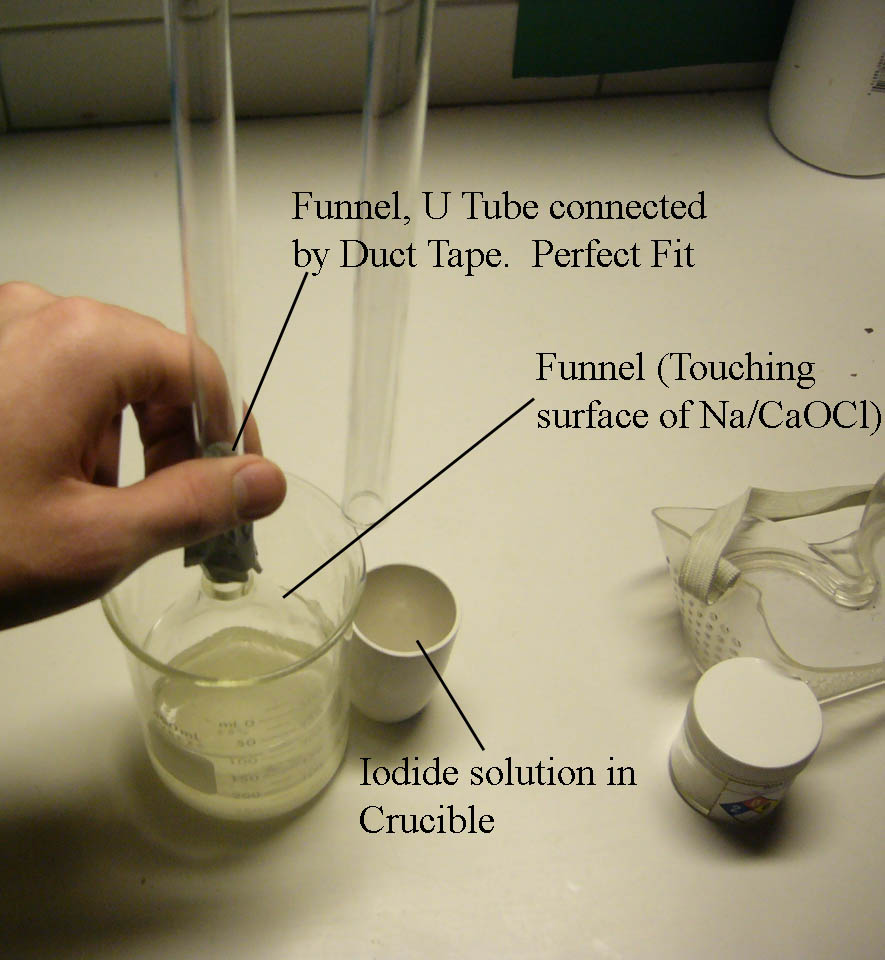 i put the hypochlorite in the beaker, pulled the funnel up just enough to add the conc HCl and dropped the funnel immediately. Cl2 was produced and brought through the tube under the surface of the I- solution. it works well; there was a very miniscule amount of HCl involved, if any, and the fact that the Cl2 was, to small degree, wet didnt make a difference.. just make sure the tube stays submerged in the I- solution, lest you spew Cl2 into the solution and push the crucible/tube away from one another, leaving you with Cl2 and only the initial amount of I2.